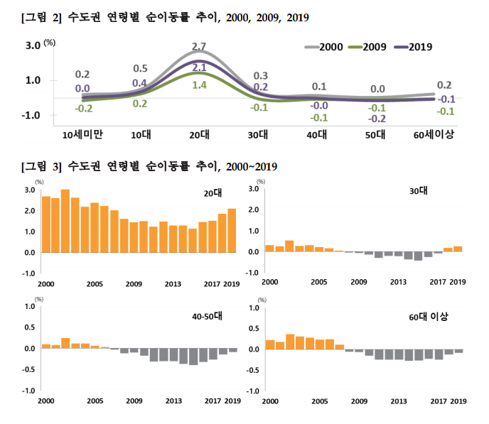 상대적으로 젊은층인 10~20대는 최근 20년간 지속적으로 순유입되었다.