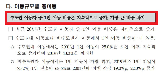 또한 수도권 이동자 중 1인 비중이 20년간 지속적으로 증가한 것을 알 수 있다.