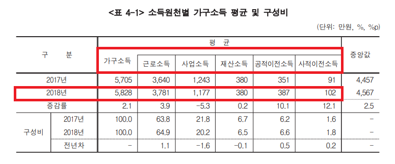 2018년 가구의 평균 소득은 5,828만원이고 그 중 가장 큰 비중을 차지한 근로소득의 평균은 3,781만원이다. 근로소득의 경우 전년인 2017년보다 3.9% 증가하였으나, 사업소득은 5.3% 감소한 1,177만원으로 조사됐다. 사업소득에는 자영업자 소득이 포함되고,