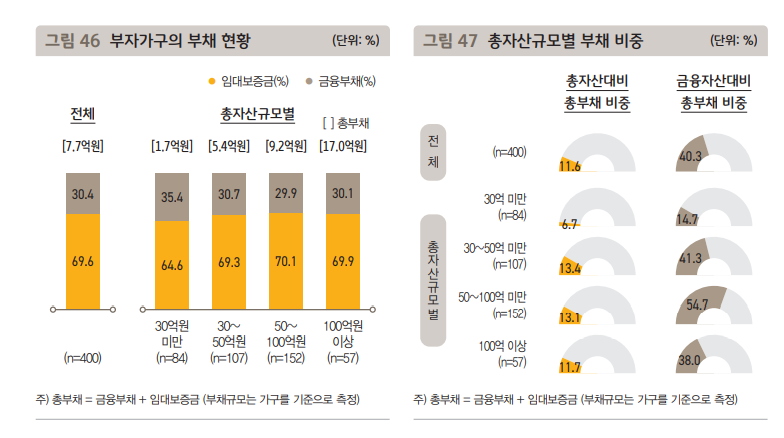 한국부자들의 부채 규모는 평균 7.7억 원, 이 중 임대보증금이 69.6%, 금융부채는 30.4% 차지.