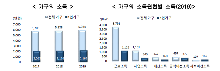 소득은 유일하게 2019년 자료인데, 1인 가구 연소득은 2,162만 원으로 전년 대비 2.2% 증가했다.