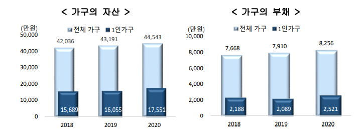 2020년 기준 1인 가구의 총자산은 1.76억 원으로 전체 가구 4.45억 원의 39.4% 수준이다.