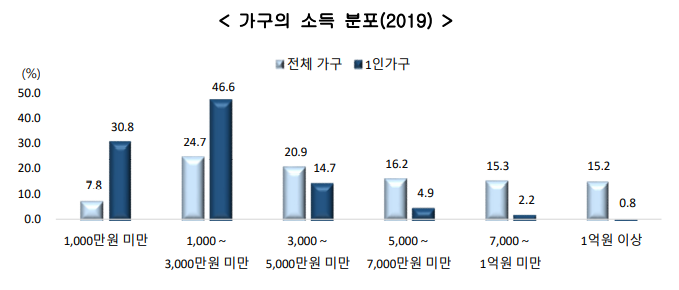 소득 분포를 보면 1인 가구 10가구 중 8가구 정도는 연소득이 3,000만 원 미만이다.