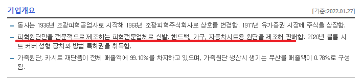조광피혁은 신발, 핸드백, 자동차시트용 원단을 제조 및 판매하는 피혁전문업체다.