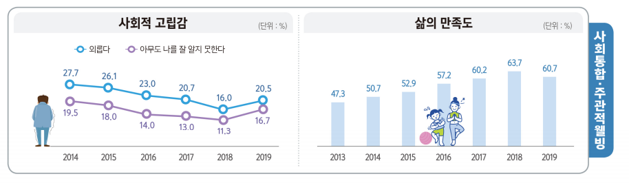 외롭다고 느끼는 비율은 지속 하락하다가 2018년 이후 급증하였고, 삶의 만족도 역시 2018년까지 지속적으로 상승하다가 그 이후 하락 반전했다.