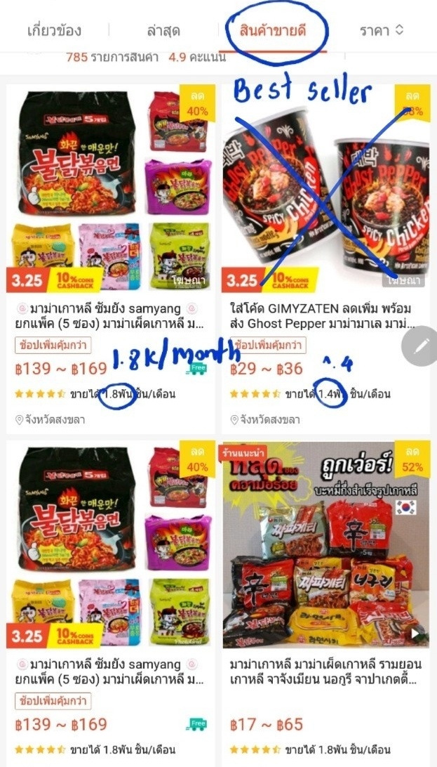 예를 들어, 태국의 한 온라인몰에서는 불닭볶음면 시리즈가 월 18,000개 팔리는 Best Seller인데